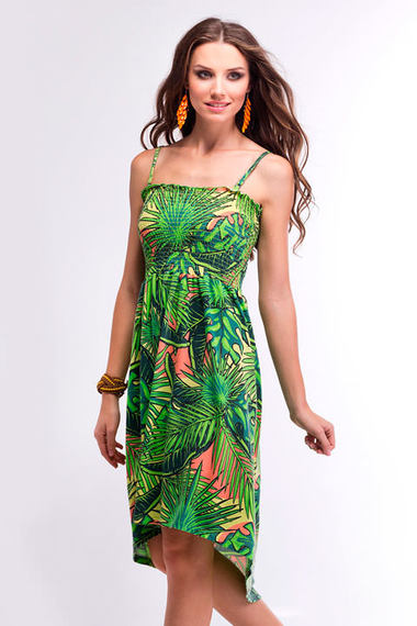 Яркий летний сарафан из вискозной ткани зеленого цвета. Модель с лифом-резинкой на тонких бретельках и свободной юбочной частью от груди.